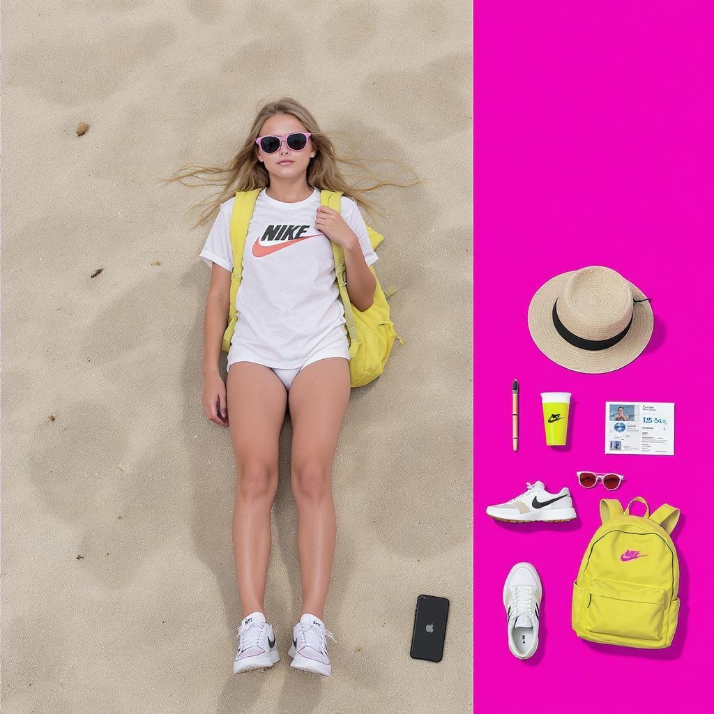 An American girl with a full body portrait wearing beach attire, donned in stylish sunglasses and a white T-shirt featuring a Nike logo. She sports white sneakers and carries a vibrant yellow backpack. The setting is captured in high-definition 8k, using a photorealistic style. The image features a knolling layout of her accessories, with the main color accent being a lively shade of magenta. The scene is shot from an elevated angle, highlighting detailed data visualization alongside the portrait, ensuring a harmonious blend of fashion and information.