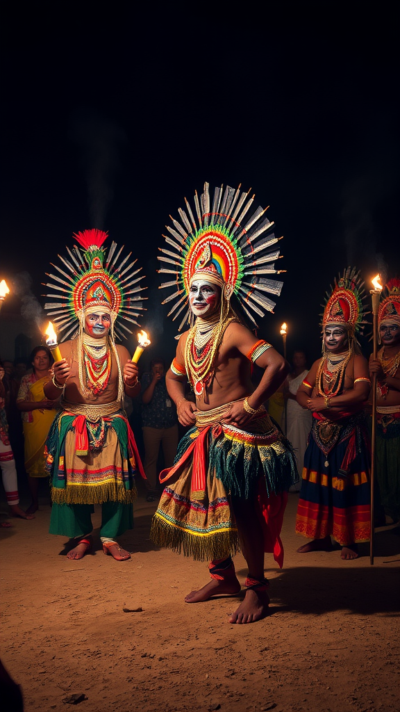 An ancient and vibrant ritual unfolds in a remote village, where performers don elaborate and colorful costumes adorned with intricate face paint and ornate headdresses, embodying deities in a mesmerizing dance that bridges the earthly and divine realms. Drums and chants reverberate through the air as villagers gather to witness this sacred spectacle, drawing energy and blessings from the mystical transformation of the dancers who invoke ancestral spirits. The night is alive with flickering torchlight, casting dramatic shadows that dance along with the performers, painting a scene of timeless spiritual celebration.