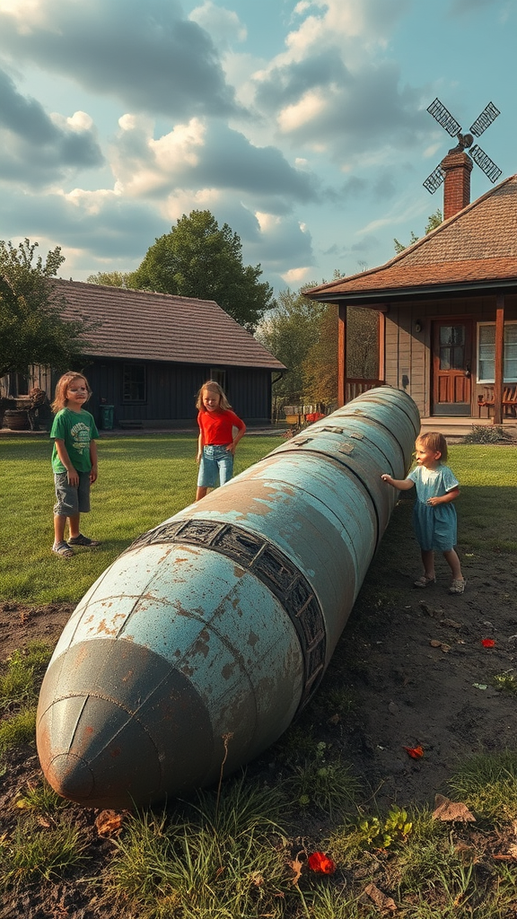 An ancient, corroded missile lies lodged in the earth of a serene rural front yard, its surface mottled with rust and time. Children laugh as they clamber over its weathered form, their innocence contrasting sharply with the ominous relic. The landscape is photo-realistic, painted with the vibrant hues of an ethereal fantasy world. The scene is infused with the tranquility of Zen Buddhism, inviting a meditative silence amidst the surreal backdrop. Echoes of Die Brücke's bold expressionism punctuate the scene, infusing the fictional landscape with an emotional depth. The surrealist atmosphere transforms reality into dreamlike imagery, where shadows stretch and colors flow like liquid, creating a tapestry that feels both familiar and otherworldly.