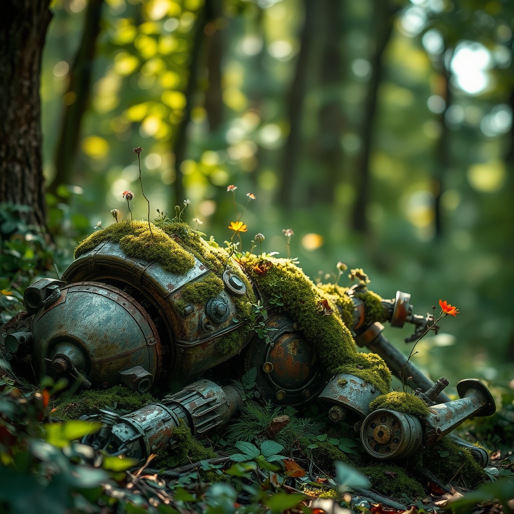 An ancient, corroded robot lays abandoned in the heart of the forest, its metallic body entwined with vibrant plants and delicate flowers sprouting from every crevice. Sunlight filters through the canopy above, casting a surreal glow against the robot's rusted surface, as a gentle breeze sways the foliage around it. Intricate details reveal the passage of time, with moss creeping over its limbs and wildflowers adorning its joints. The background blurs into a dreamy haze of green, creating a natural bokeh effect that emphasizes the hyper-realistic textures of the scene, capturing the poignant beauty of nature reclaiming technology.