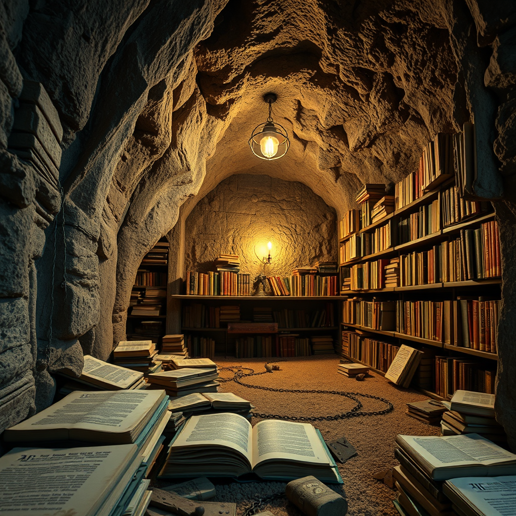 An ancient, forgotten library is discovered underground, filled with books that write themselves with stories from alternate realities, revealing secrets and timelines that could reshape the world above.