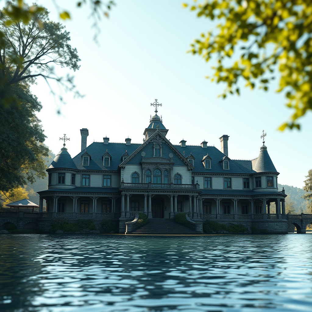 An ancient lakeside mansion, 8k ultra high definition, flawless composition, stunningly detailed and intricate, octane render, featured on ArtStation, artistic with a photorealistic touch, concept art inspired by Greg Rutkowski, cinematic and atmospheric lighting, hyperrealism, depth of field photography, evokes a sense of timeless beauty, surrounded by a serene landscape with gentle ripples on the water and dappled sunlight filtering through lush trees.