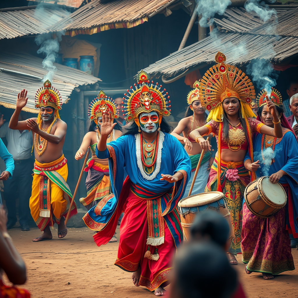 An ancient ritual unfolds in a vibrant village, where vivid costumes and elaborate face paint transform performers into divine beings. These living embodiments of gods and spirits move with mesmerizing grace, their every gesture telling stories of tradition and mythology. The air is thick with the aroma of incense and the rhythmic beats of drums, drawing the community into a shared realm of sacred celebration and awe-inspiring spectacle. Guided by ancestral reverence, this fervent dance blurs the line between the mortal and the divine, creating a mystical experience steeped in history and enchantment.