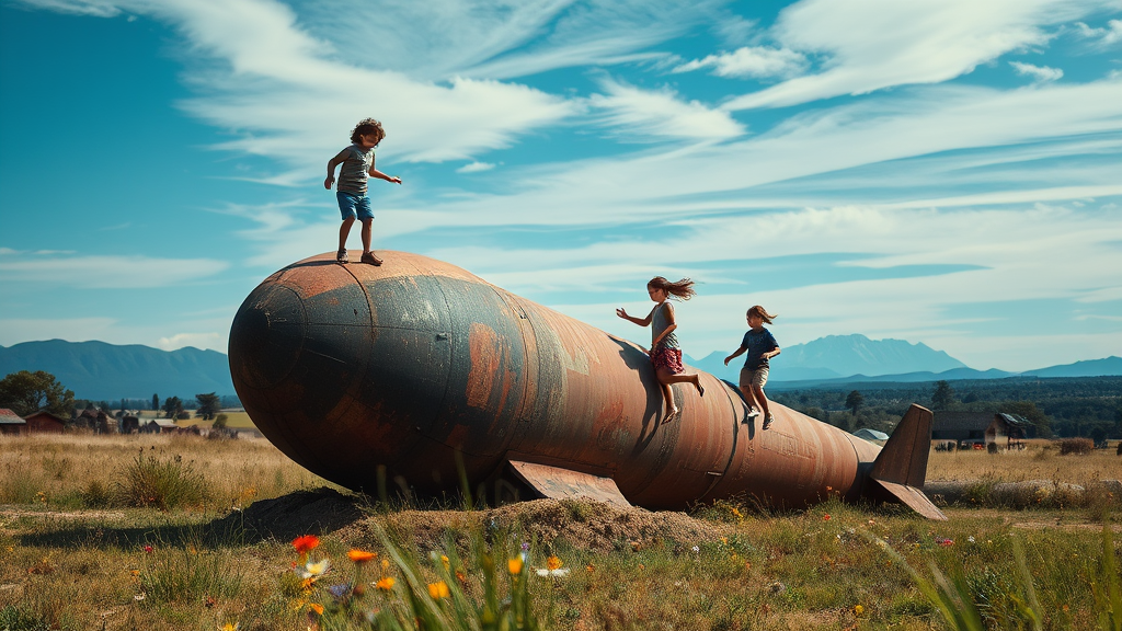 An ancient, rusting missile embedded in the earth of a rural front yard serves as an unusual playground for children who dance and laugh upon its weathered surface, blending into the photo-realistic landscape. The scene is enveloped in an ethereal fantasy ambiance, where soft, dreamy light casts gentle shadows across the meadow. The composition reflects a Zen Buddhism influence, capturing a serene balance amidst the surreal juxtaposition. Inspired by Die Brücke and fictional landscapes, the dreamlike imagery invites a sense of wonder, as vibrant wildflowers sway gently around the missile, and distant mountains rise like forgotten giants beneath a sky brushed with surrealist hues.