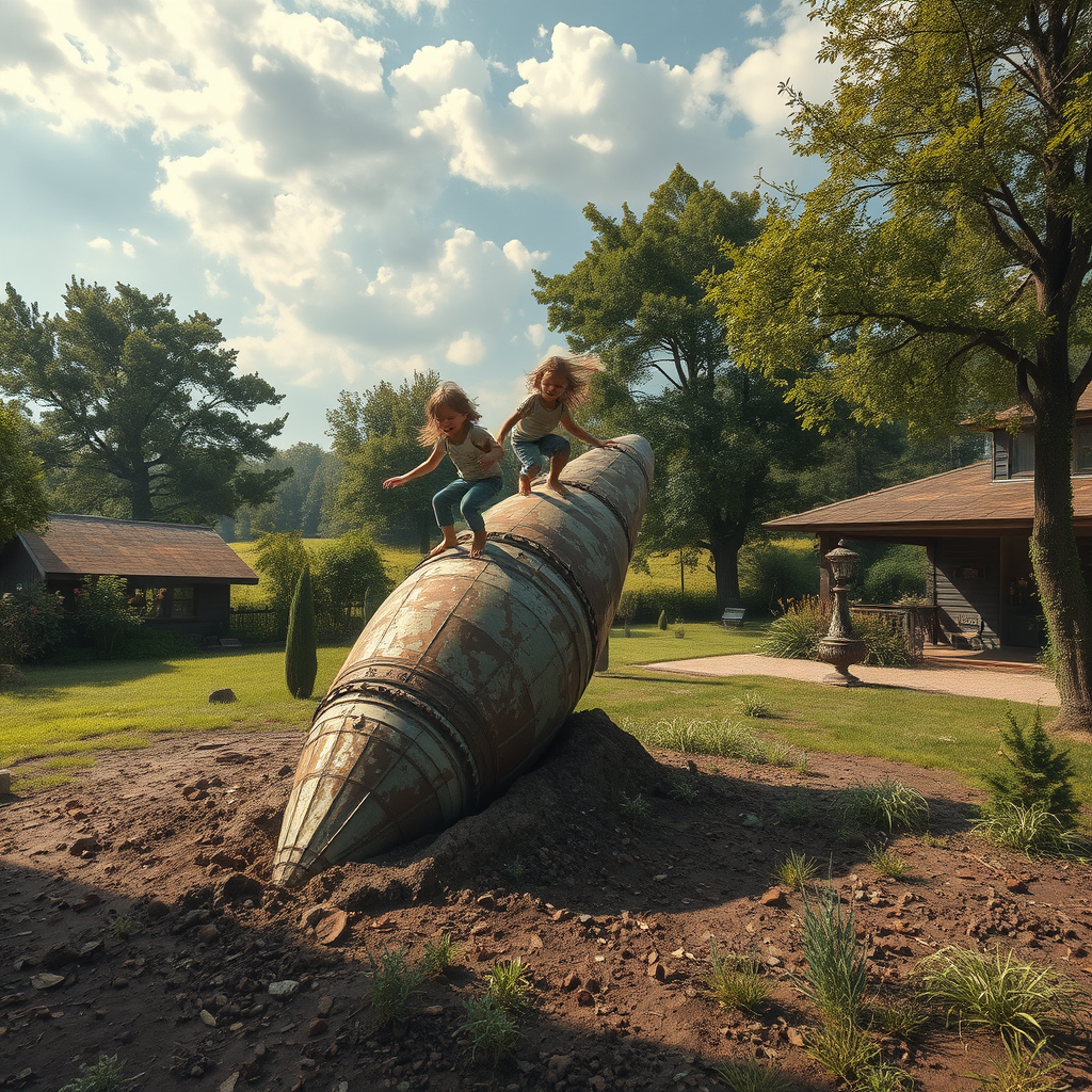 An ancient, rusting missile lodged upright in the soil of a rustic countryside garden, its metallic surface weathered by time. Children are joyfully playing on the missile, their laughter echoing in the serene air. The landscape is rendered in photo-realistic detail, a mystical aura envelops the scene, blending ethereal fantasy with a serene, zen-like tranquility. The setting draws inspiration from Die Brücke's vivid expressionism, merging with fictional and surrealist landscapes to evoke a dreamlike quality. dappled sunlight filters through lush trees casting soft shadows across the yard as clouds float lazily in a vast sky, enhancing the surreal ambiance.