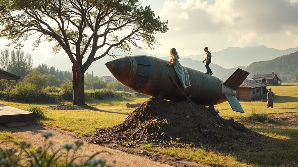 An ancient, rusting unexploded missile firmly embedded in the earth of a serene rural front yard, with a group of carefree children climbing and playing on it amidst a verdant landscape. The scene unfolds in a photo-realistic style, blending ethereal fantasy elements with a zen-like tranquility. The composition draws inspiration from the die Brücke art movement, creating a fictional landscape that merges surrealism with dreamlike imagery. The surroundings are bathed in soft, diffuse light, casting gentle shadows that dance across the earth, trees whispering in the gentle breeze, and the distant mountains providing a mystical backdrop. A delicate balance between the innocence of childhood and the haunting presence of the missile creates an arresting visual story.