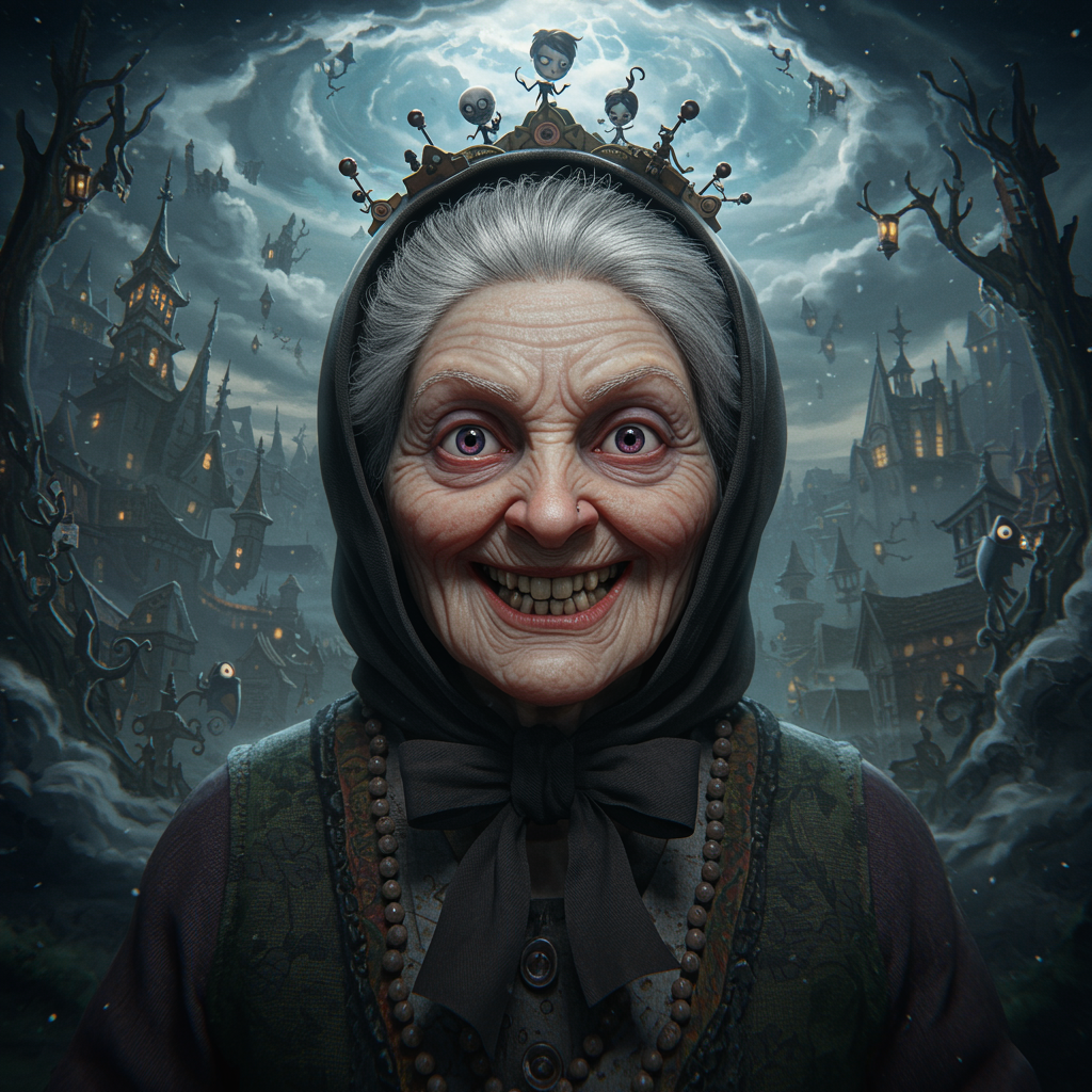 An ancient, whimsical grandmother with an eerie grin, staring with piercing, sharp eyes. The scene unfolds under a surreal, swirling sky of madness conjured by Mundford, featuring intricate chibi elements by Artificial Nightmares blended with the eerie gothic flair of Tim Burton. The composition is baroque and maximalist with an ultra-realistic photorealism inspired by the detailed face features and artistry of Stanley Artgerm. Her expression, both organic and dynamic, presents an otherworldly essence, akin to the masterful techniques of Caravaggio and Raphael, rendered in oil on canvas. The artwork boasts stunning 8k quality with intricate octane render detailing, crisp, cinematic chiaroscuro lighting, reminiscent of an award-winning photograph. This masterpiece, a perfect fusion of high-definition photorealistic concept art and the visionary stylings of modern creators like Greg Rutkowski, Beeple, Beksinski, and Giger, captures the mesmerizing beauty and madness of a fantastical scene, worthy of trending on ArtStation.