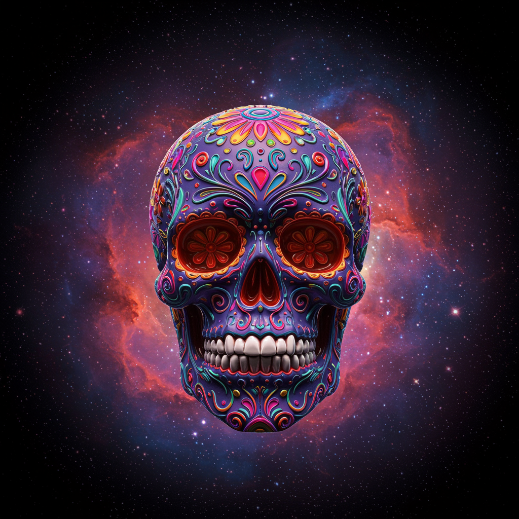 An animated skull made of swirling, active ferrofluid takes center stage, adorned with intricate Dia de Muertos patterns in vibrant colors. Surrounding it is a psychedelic nebula, bursting with cosmic hues and flowing with an LSD-inspired dreamscape of swirling galaxies and starry constellations.