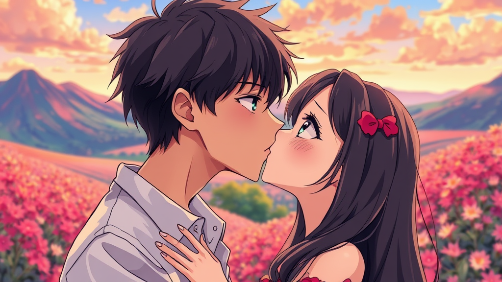 An anime boy leans in to gently kiss a breathtaking girl, their eyes filled with emotion. The scene exudes a sense of playful intimacy with a touch of ecchi allure, reminiscent of Yamatogawa's expressive and bold style. The background is a vibrant and colorful landscape that complements the characters' vivid expressions, enhancing the overall romantic and slightly provocative atmosphere. The artwork is crisp and detailed, capturing a moment of affection that feels both genuine and captivating.