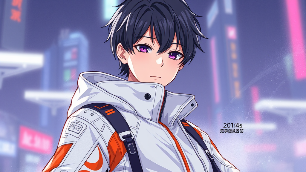 An anime character in a white and orange jacket, embodying the cyberpunk aesthetic with nuances of dark white and light violet tones, featuring precise brushwork and elements of automatism, presented as official art. This depiction includes lucid developments of the character's features with high detail, capturing a sleek and futuristic essence, while retaining the stylistic flair of a hi-tech world.