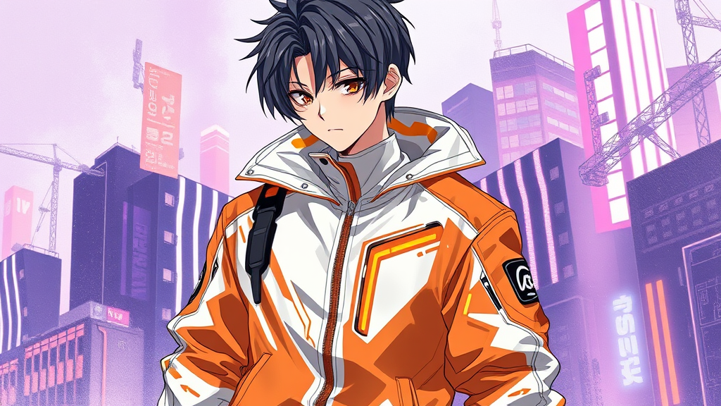 An anime character wearing a sleek white and orange jacket, embodying the essence of cyberpunk, set in a dark white and soft violet backdrop. The scene features precise brushwork with elements of automatism, capturing the essence of official art. The character displays lucid developments, highlighted by high detail and intricate design, evoking a futuristic allure. Subtle modifications include neon accents on the jacket and a backdrop replete with glimmering cityscapes, enhancing the overall cyberpunk aesthetic.