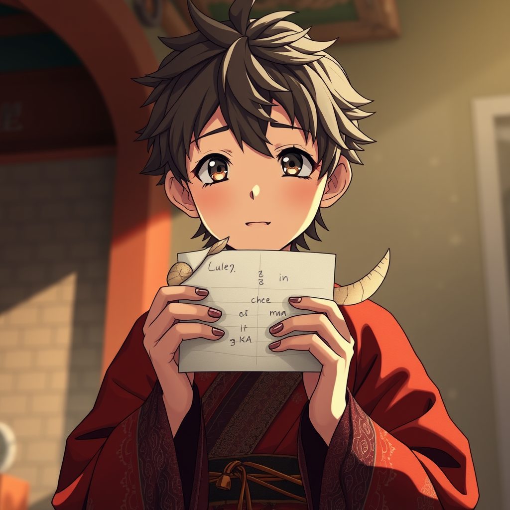 An anime character with a lifelike expression, dressed in intricately detailed costumes in the hues of red and brown, reminiscent of Luke Fildes' realism, is holding a piece of paper that's transformed into an animal. The scene captures Max Rive's grand sense of scale and depth, styled with TarΕ Okamoto's bold, expressive patterns. The ambiance is cinematic, with a Cinestill 50D effect highlighting the rich textures and subtle gradients in the background.