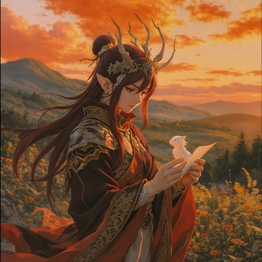 An anime character with an intricate costume of reds and browns stands in a lush landscape, holding a piece of paper that transforms into a delicate animal. The scene captures the realism and detailed textures reminiscent of Max Rive's and Luke Fildes' styles, blended with the avant-garde essence of TarΕ Okamoto. The setting is bathed in the soft, cinematic glow of sunset like Cinestill 50D film, with an ethereal and artistic raw style, accentuating the character's focused expression and the mystical transformation before them.