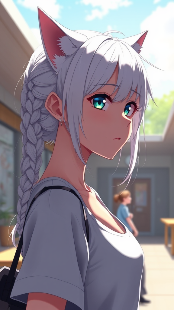 An anime girl in side view with a beautiful, youthful appearance, featuring medium-length white braided hair and cat ears. She has captivating blue eyes and an anxious expression. Her medium chest and torso are visible in a school setting, with a hyperdetailed background capturing the essence of a school environment. The scene is bathed in natural light with detailed reflections and volumetric lighting, creating a cinematic, ultra-realistic atmosphere. The artwork is intricately detailed and full of vibrant, rich colors, showcasing a blend of anime and fantasy art. The illustration is a professional, majestic oil painting style, with influences from Studio Ghibli, Jeremy Mann, and Greg Manchess, emphasizing sharp focus and vivid colors. This masterpiece has a deep depth of field and is trending on platforms like ArtStation and CGSociety.