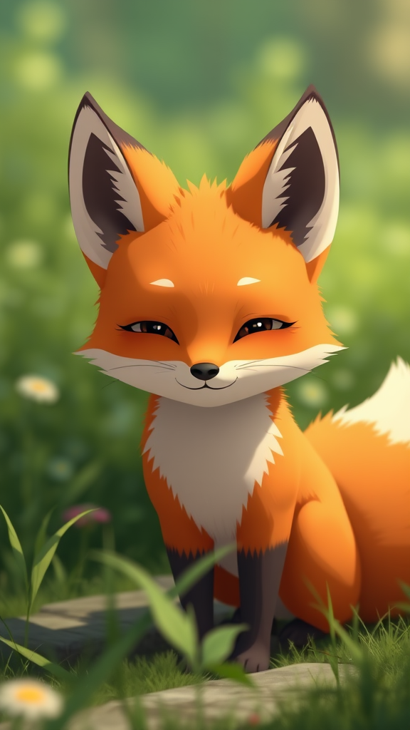 An anime-inspired shy young fox, presented with an orange fluffy tail and a gentle, tentative demeanor, in the style of Production I.G. The scene uses earthy tones and depicts a serene and tranquil atmosphere with a lush green background. Rendered in 3ds Max and enhanced with V-ray for soft, realistic lighting, the composition exudes a calming and natural ambiance.