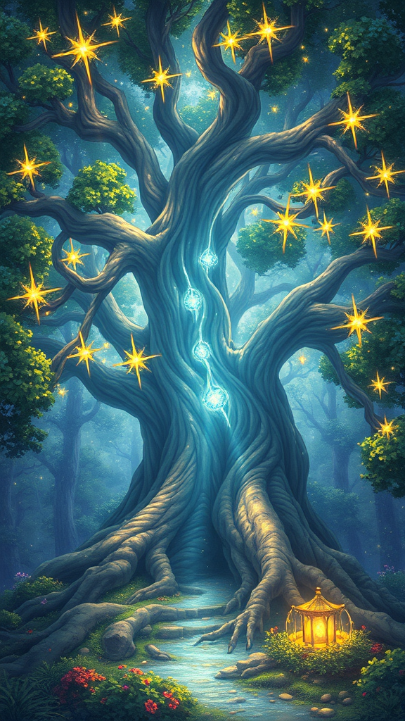 An anime style artwork depicting a magnificent tree with an abundance of stars nestled within its heart, reflecting luminous landscapes and richly detailed art nouveau aesthetics. The scene embodies pristine naturalism, with intricate details reminiscent of snailcore and D&D elements. The tree's bark and leaves shimmer with an ethereal glow, casting light-filled patterns across the forest floor. Twinkling stars among the branches create a celestial ambiance, blending seamlessly with the vibrant natural surroundings. This enchanting landscape invites viewers to explore the magical intersection of nature and fantasy in a harmonious, dreamlike setting.