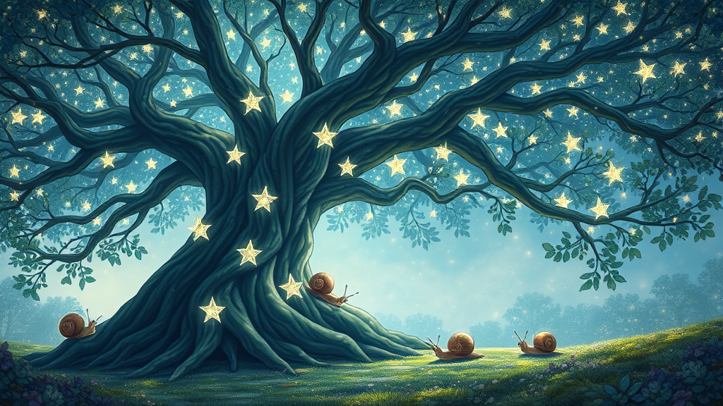 An anime style artwork depicting a mystical tree with countless twinkling stars embedded in its core, enveloped by a luminous landscape. The scene is richly detailed in art nouveau style, showcasing intertwining branches and delicate leaf patterns, capturing pristine naturalism. Elements of 'snailcore' are subtly woven in, with whimsical snails adding character and charm. The environment echoes an enchanting D&D realm, where magical creatures roam under soft, dappled light filtering through the canopy. The atmosphere is ethereal and serene, with light-filled spaces creating a sense of wonder and discovery in this magical natural setting.