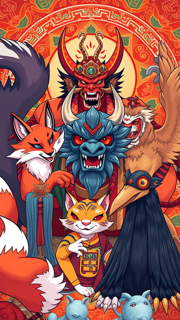 An anime-style illustration in HD 2K featuring a kitsuné with fox-like features including multiple tails and mystical aura, an imposing Oni with a fierce expression and traditional attire, a Nué depicted as a chimera with elements of a monkey, tiger, and snake, and a Tengu with distinctive crow-like characteristics and a long nose, all set against a backdrop inspired by intricate, colorful funji decor with whimsical yet elegant patterns, the scene is highly detailed, showcasing vibrant colors, and capturing a harmonious blend of mythical creatures and decorative elements.
