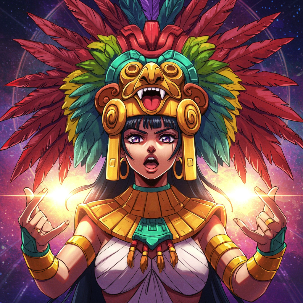 An anime-style portrait of an Aztec princess wearing an elaborate Moctezuma-inspired headdress, radiating an inner light, highly detailed with vibrant colors. Featuring the dynamic and expressive art style of Studio Ghibli blended with the boldness of JoJo's Bizarre Adventure, the illustration captures an action-packed essence, showcasing the princess in a powerful and regal stance against a colorful, mystical backdrop.
