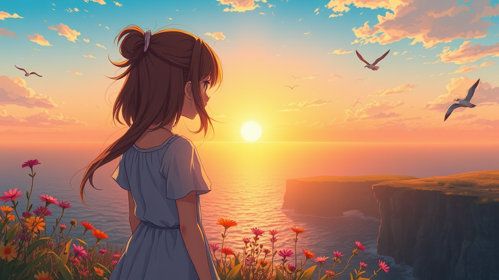 An anime visual of an adorable girl gazing at a golden sunset over the vast ocean, standing gracefully at the edge of a cliff, with her hair gently swaying in the breeze, surrounded by vibrant wildflowers and a flock of distant seagulls soaring through the sky.