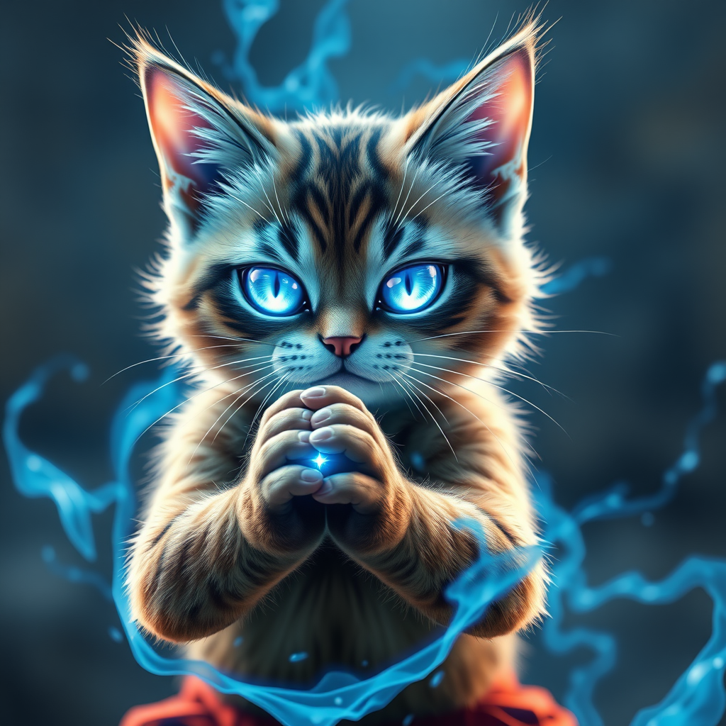 An anthropomorphic adorable cat with mesmerizing Sharingan eyes, its hands clasped together radiating an intense blue light, adopting a dynamic combat stance with chakra visibly flowing, enveloped in a shimmering blue aura, exuding an intense and formidable presence, rendered in hyper detail, capturing the feel of a dramatic ultrawide movie still.