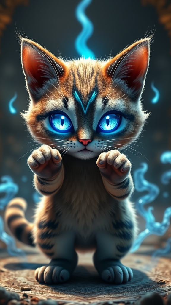An anthropomorphic adorable cat with piercing Sharingan eyes, hands clasped and radiating a vibrant azure light, poised in an intense battle stance, chakra flowing around and surrounded by a shimmering cerulean aura, exuding an aura of immense power, intricately detailed, captured in an ultrawide cinematic frame.