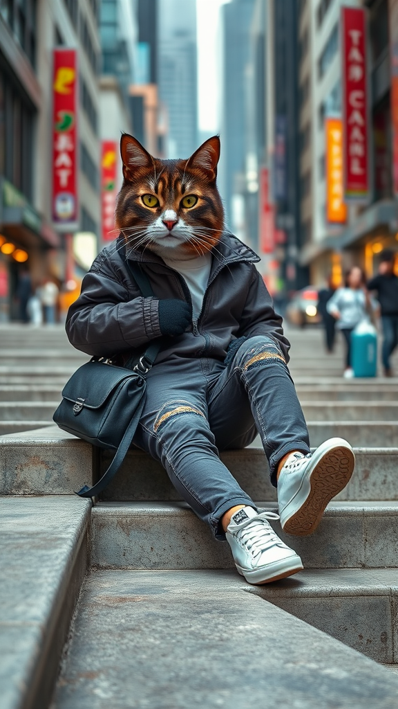 An anthropomorphic cat named "Street Style KOL Kitty" exudes urban coolness, donning a sleek dark brown flight jacket and crisp white sneakers, effortlessly balancing a chic COACH bag over one shoulder. Set against the dynamic backdrop of a bustling cityscape, KOL Kitty lounges casually on wide stone stairs, the wide depth of field capturing the vibrant energy of street life. The jacket is adorned with subtle mori style stripes, adding an eclectic touch to this feline fashionista's ensemble. The scene pulsates with a hip-hop vibe as the master shot in 4K clarity immortalizes the essence of street chic in this captivating tableau.