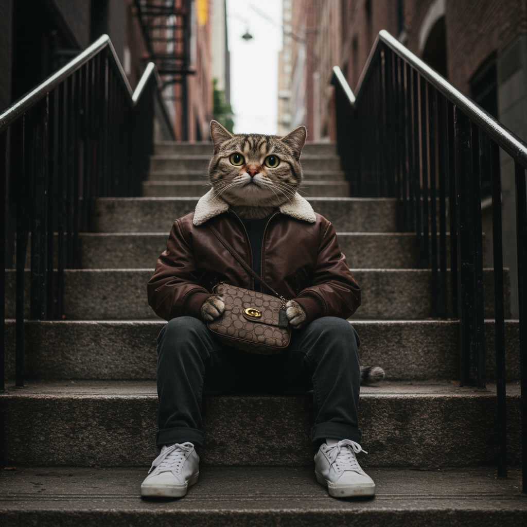An anthropomorphic cat named "Street Style KOL Kitty" is sitting on the stairs of an urban street, exuding a hip-hop flair with a touch of elegance. The feline is wearing a sleek dark brown flight jacket paired with pristine white sneakers, all while casually carrying a chic COACH bag. The scene captures the essence of street life, as vibrant mori-style stripes subtly adorn the background, enhancing the visual narrative. The wide depth of field in this 4K master shot emphasizes the bustling city life surrounding the fashionable kitty, making it the epitome of cool urban chic.