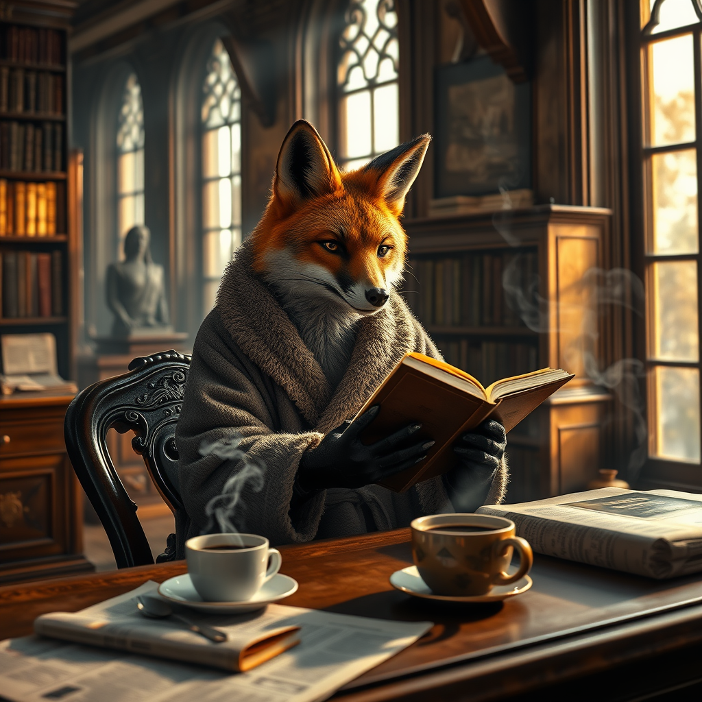 An anthropomorphic fox in a plush robe sits at a vintage wooden table in a dusty library, engrossed in an old leather-bound book. The late morning light filters through tall windows, creating a warm, cinematic atmosphere. Nearby, an untouched newspaper hints at a slower pace of life. Steam rises from a freshly brewed cup of coffee, casting swirling shadows on the fox's fur. The scene captures a moment of serene contemplation with an air of timeless elegance.