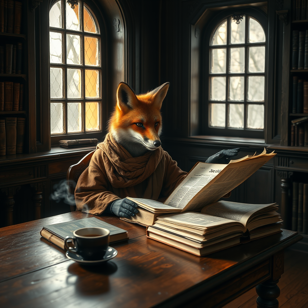 An anthropomorphic fox sits at a vintage wooden table, engrossed in a leather-bound book, its robe a tapestry of autumn hues. The scene is a portrait capturing a moment of quiet contemplation, with the fox occasionally glancing at a nearby newspaper. The late morning sun filters through the dusty windows of an old library, casting a warm glow over the scene. A steaming cup of morning coffee rests beside the fox, its aroma blending with the scent of aged paper. The outfit is cinematic in its elegance, perfectly complementing the timeless ambiance of this secluded, tranquil corner.