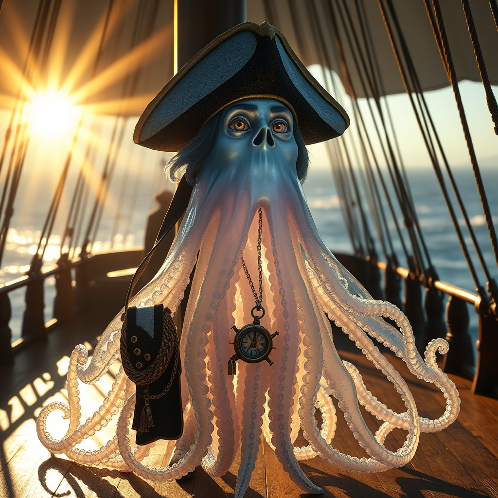 An anthropomorphic jellyfish pirate captain stands proudly on the deck of a ship, its translucent tentacles cascading like an elegant cloak, catching the sunlight. The scene is dramatically backlit, with golden light rays filtering through the semi-transparent form, casting intricate patterns across the deck. The pirate's eyes glint with wisdom and a hint of mischief, adorned with a weathered tricorn hat and a compass hanging from its belt. The highly detailed portrait showcases the texture of its gelatinous skin, shimmering with hints of blue and purple, a masterpiece trending on art platforms.