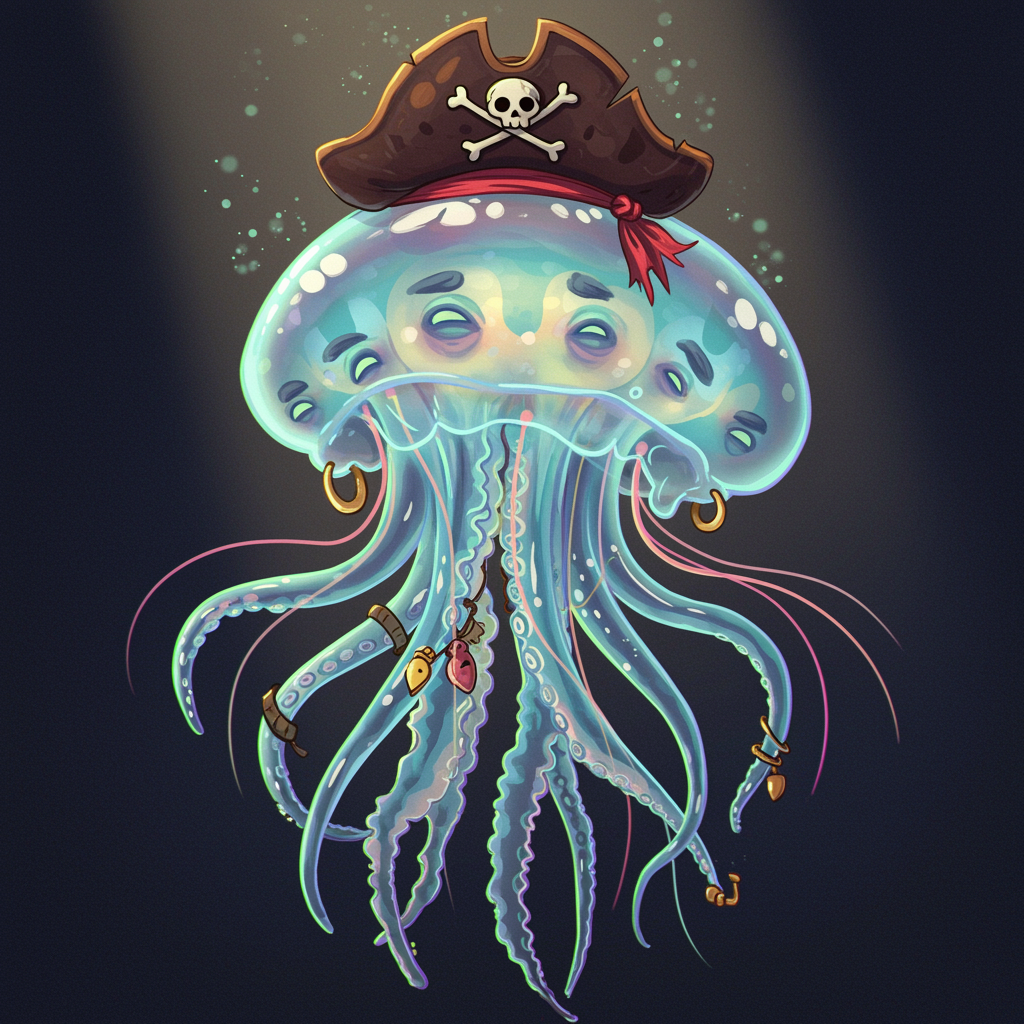 An anthropomorphic jellyfish pirate with a whimsical charm, posed in a character portrait design study. The scene is backlit, casting light rays that filter through its translucent body, creating a shimmering effect. Its multi-headed form adds a fantastical element, each head expressing a different emotion. The illustration is highly detailed and captures the essence of a cartoon style, blending vector art and clipart aesthetics. The character wears a pirate hat jauntily atop one of its heads, complete with a tattered bandanna and a dangling earring. Its tentacles spill down like flowing robes, adorned with small trinkets and treasures. This unique creation trends on ArtStation, combining distortion and creativity to enhance its pirate persona.