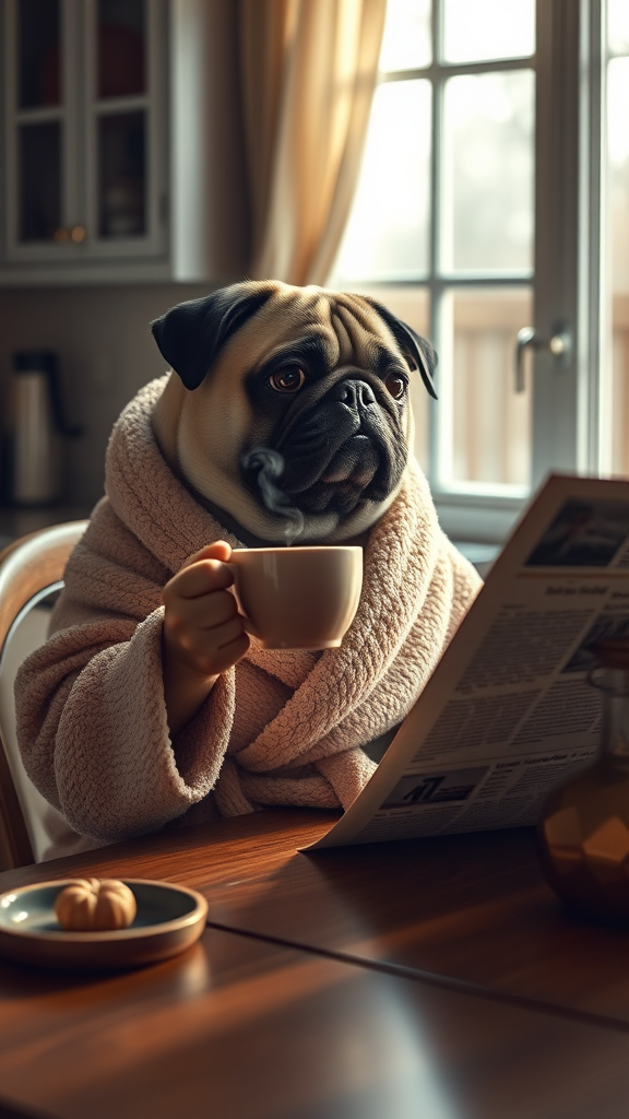 An anthropomorphic pug dog clad in a plush robe sits at a breakfast table, delicately holding a steaming cup of coffee while skimming through the morning newspaper. The scene is set in a softly lit, cozy kitchen, where soothing tones of early morning light filter through the windows, casting gentle shadows on the table. Each detail is intricately captured, from the texture of the pug's fur to the fine lines of the newspaper, all rendered in high quality with a subtle, low contrast cinematic feel. The atmosphere is relaxed and intimate, inviting the viewer to linger in this tranquil morning ritual.