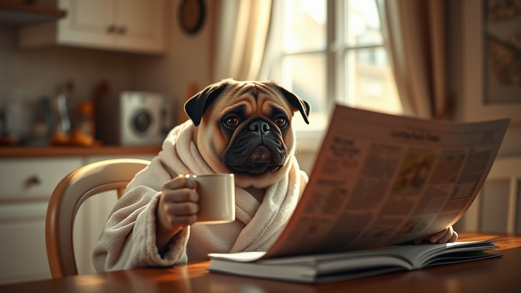 An anthropomorphic pug dog in a luxurious robe, leisurely enjoying breakfast at a sunlit kitchen table, delicately holding a steaming coffee mug in one paw while flipping through a newspaper with the other, the scene captured in a cinematic, high-quality shot with soothing tones and intricate details, the morning light creating a soft, low contrast ambiance that highlights the pug's expressive features and the textured fabric of the robe, a serene start to the day.