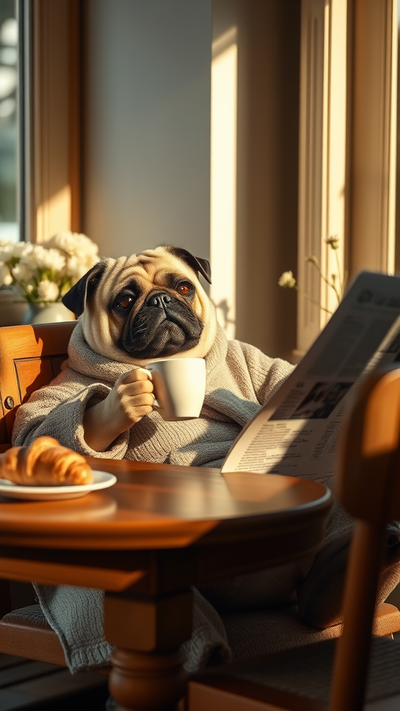 An anthropomorphic pug dog lounging casually at a wooden breakfast table, clad in a cozy robe. Sunlight filters softly through a nearby window, casting soothing tones across the scene. The pug, with endearing expression, sips coffee from a delicate mug while perusing the morning newspaper. Warm, intricate details highlight the pug's expressive eyes and textured fur, carefully showcasing an atmosphere of calmness and contentment. The setting is elegantly arranged, with a simple vase of fresh flowers and a lightly buttered croissant nearby. The softly muted colors create a cinematic, low-contrast ambience, capturing the tranquility of a relaxed morning ritual.