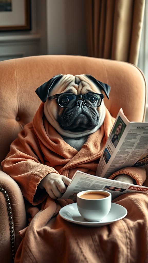 An anthropomorphic pug dog sits comfortably in a plush armchair, draped in an elegant robe, leisurely enjoying breakfast with a steaming cup of coffee at its side. The pug's expression is one of contentment and curiosity as it peruses the morning newspaper, glasses perched on its snout. The scene is bathed in soft, soothing tones, with the light filtering through a nearby window casting a gentle glow. The setting exudes a cinematic quality, marked by intricate details in the fabric of the robe and the textures of the breakfast spread. The overall composition embraces a low contrast, high-quality aesthetic, capturing the cozy and serene ambiance of a quiet morning.