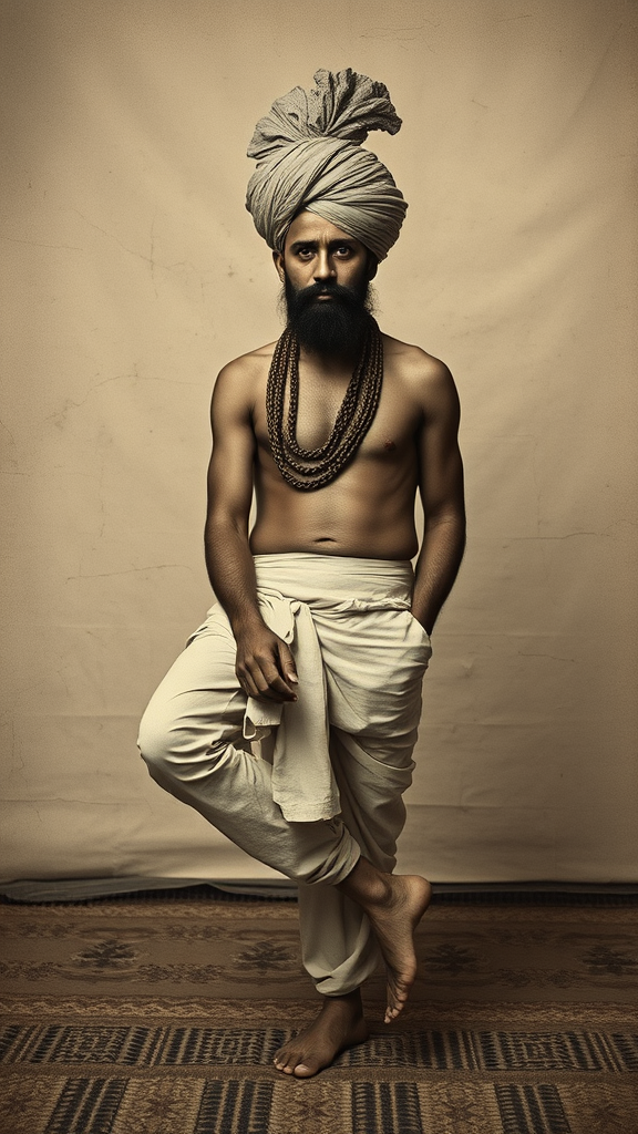 An antique photograph of an Indian man wearing a turban, positioned with his legs elegantly elevated, styled with abstract, disfigured forms reminiscent of mid-20th century Middle Eastern and North African art, embodying a brooding and introspective mood. The composition is sparse and minimalist, blending elements of photographic texture and woven patterns, presenting a crumpled yet intriguing aesthetic, maintaining an elongated 3:4 aspect ratio.