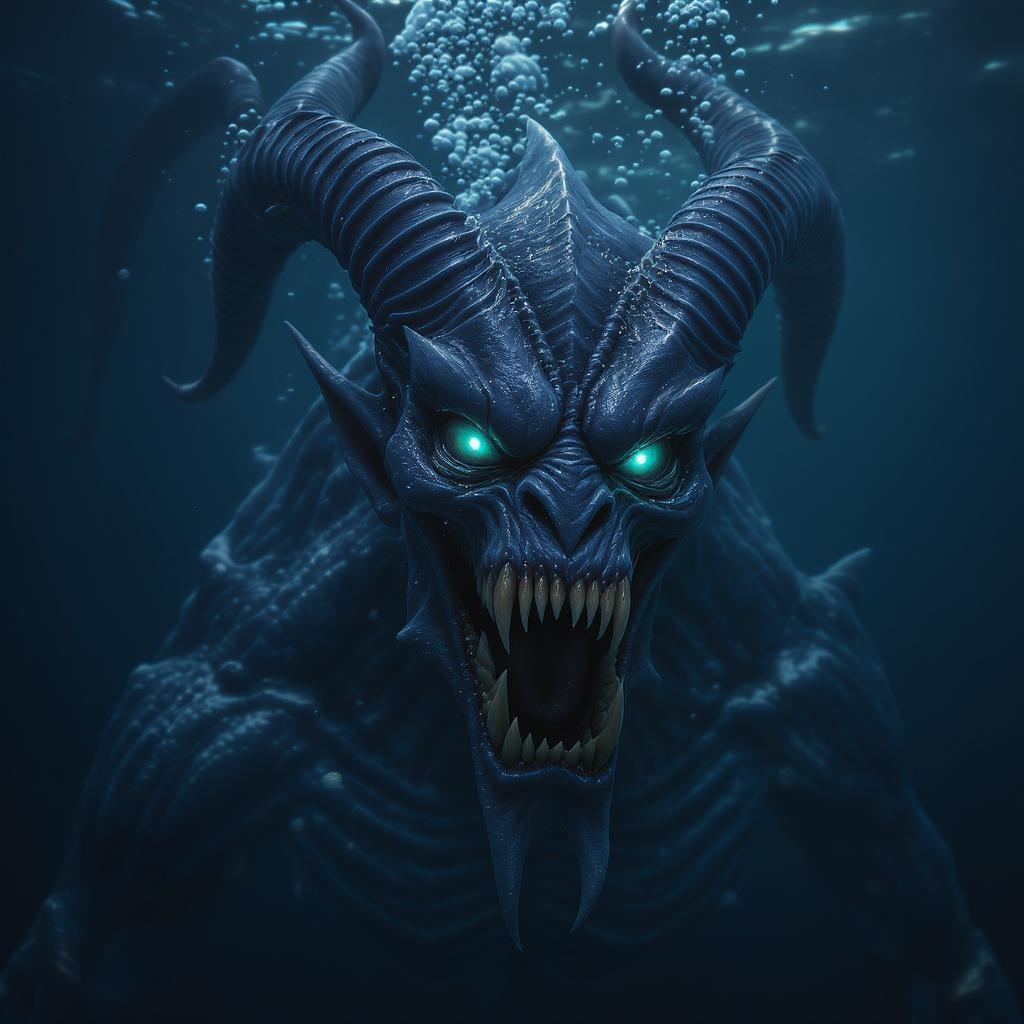 An aquatic demon with a humanoid form and sleek, angular features, exhibiting a deep indigo skin tone, eyes gleaming with a menacing intelligence. Its sharp, bared teeth are emphasized by an open, snarling mouth. The creature's brow is furrowed in a perpetual expression of malevolence. It is submerged in an underwater realm, surrounded by the undulating shadows of the ocean deep. The scene is rendered in Unreal Engine 4, showcasing stunning cinematic lighting that highlights the demon's intimidating presence and the ethereal beauty of its aquatic environment.