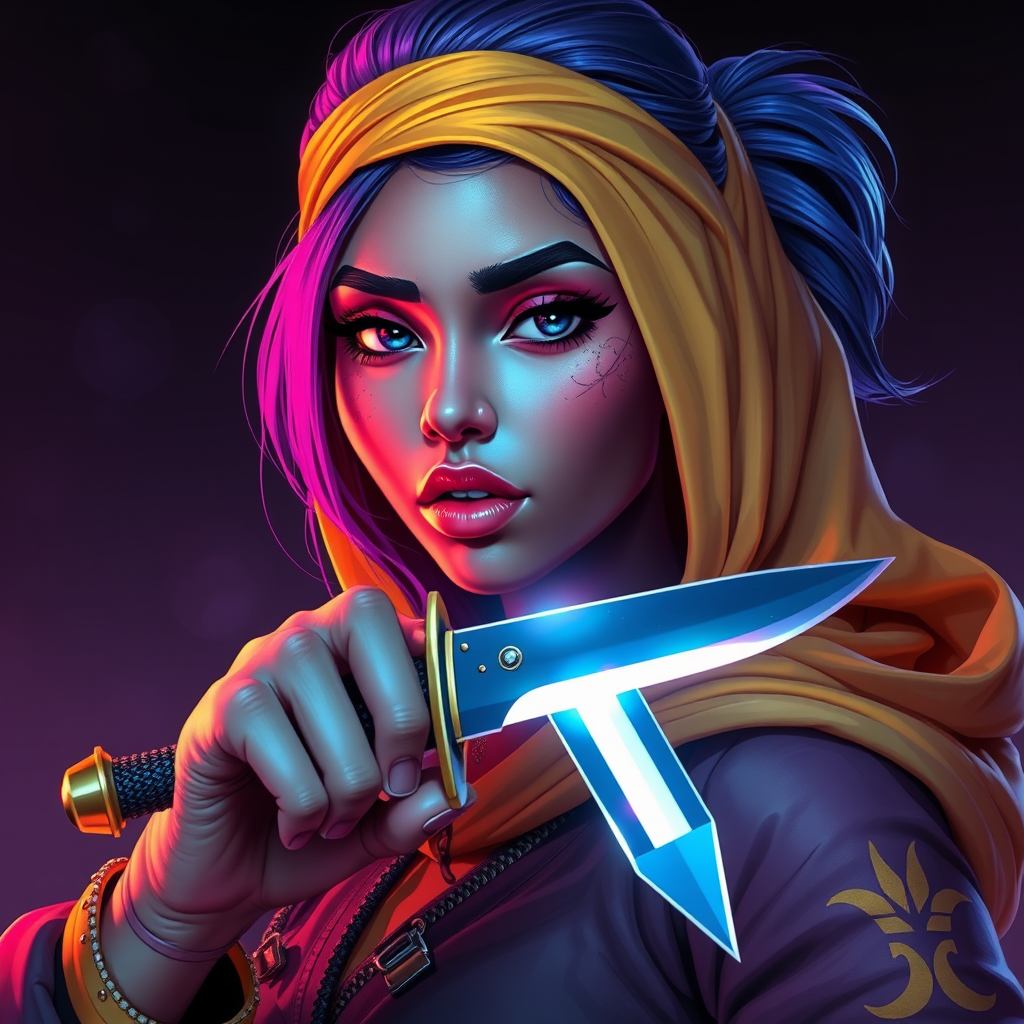 An Arab woman with bold purple hair and a vividly colorful outfit clutches a gleaming knife, exuding an intriguing aura reminiscent of afrofuturism. Her features are brought to life with vibrant realistic colors in a style inspired by Rossdraws, merging a cartoonish charm with hyper-realistic details. The digital artwork dances with bright pastel hues and dark vibrant colors, creating a stunning visual tapestry that captures the essence of colorful concept art. The piece elevates traditional fan art into a gorgeous and striking rendition, showcasing a beautiful balance between stunning art style and vivid hyper-realism.