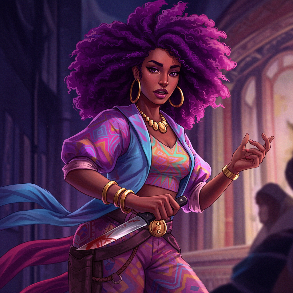 An Arab woman with vibrant purple hair and a lively, colorful outfit holding a knife, inspired by afrofuturism and RossDraws' style, featuring a dynamic blend of vibrant realistic colors. The scene is a colorful digital painting, capturing a sense of dynamic energy and vivid concept art. The artwork blends RossDraws’ pastel vibrancy with stunning, beautiful digital techniques, showcasing dark yet vibrant colors in a hyper-realistic approach, resulting in a stunning and gorgeous piece of digital art.