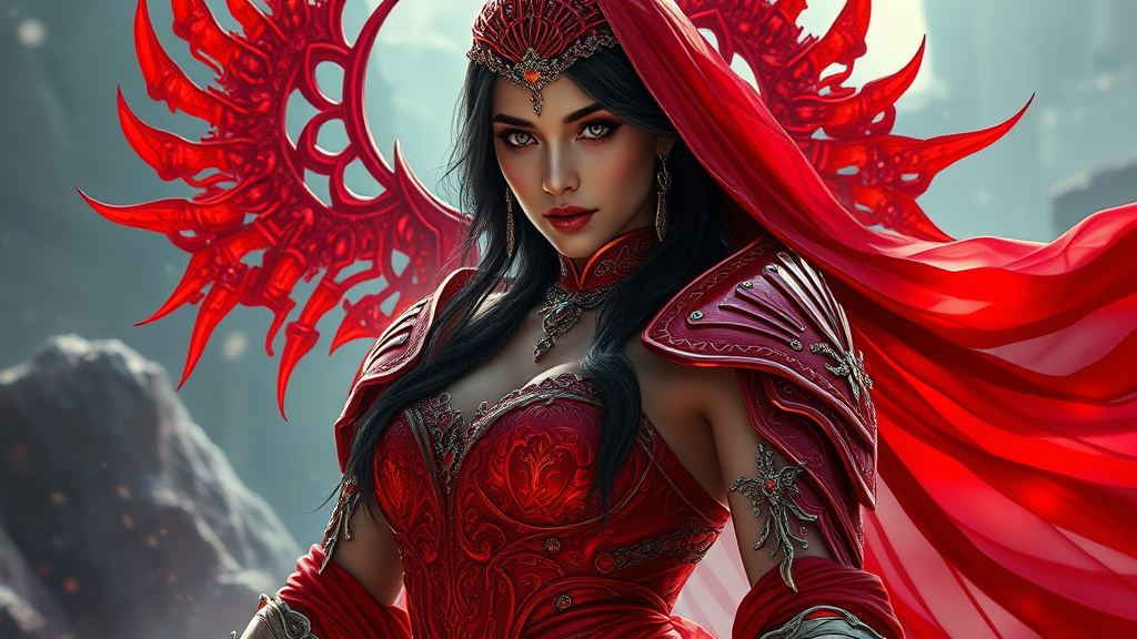 An Arabian woman in a crimson corset and flowing red gown, exuding an aura of majestic strength and grace, reminiscent of Karol Bak's intricate style combined with Alena Aenami's ethereal touch and Artgerm's dynamic flair. Set in a vibrant fantasy realm, the hyperrealistic art showcases her in 8k stunning detail, capturing the essence of a captivating beauty. She is adorned with intricately designed red armor that gleams under a mythical light, echoing Julie Bell's powerful aesthetic and the futuristic edge of Beeple's vision. This enchanting lady in red embodies elegance and power, a masterpiece of realistic fantasy artwork.