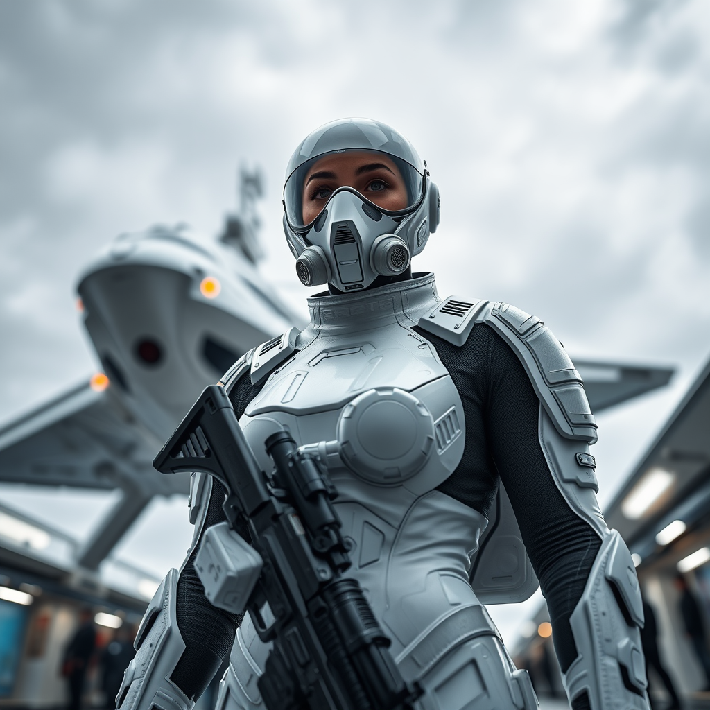 An armed female figure clad in a sleek white sci-fi spacesuit stands in a bustling spaceport, a futuristic spaceship looming in the background. The sky is overcast, creating a moody atmosphere. She wears a high-tech visor and a sophisticated sci-fi respirator, her bald head emphasizing the streamlined design. Her spacesuit integrates plate armor and isolated protective elements, crafted with intricate detail. The perspective is from below, capturing her as a dominant figure against the backdrop. The scene is rendered in exquisite photorealism with natural textures and lighting, enhanced by cinematic effects like ray tracing and a subtle blur. The image presents a sense of photographic realism with a cinematic touch, employing long exposure techniques for dramatic emphasis. The 8K Ultra-HD resolution showcases every nuance in stunning detail, immersing the viewer in a high-quality, sci-fi movie aesthetic, with a blend of natural and moody lighting enhancing the scene's dynamic range.