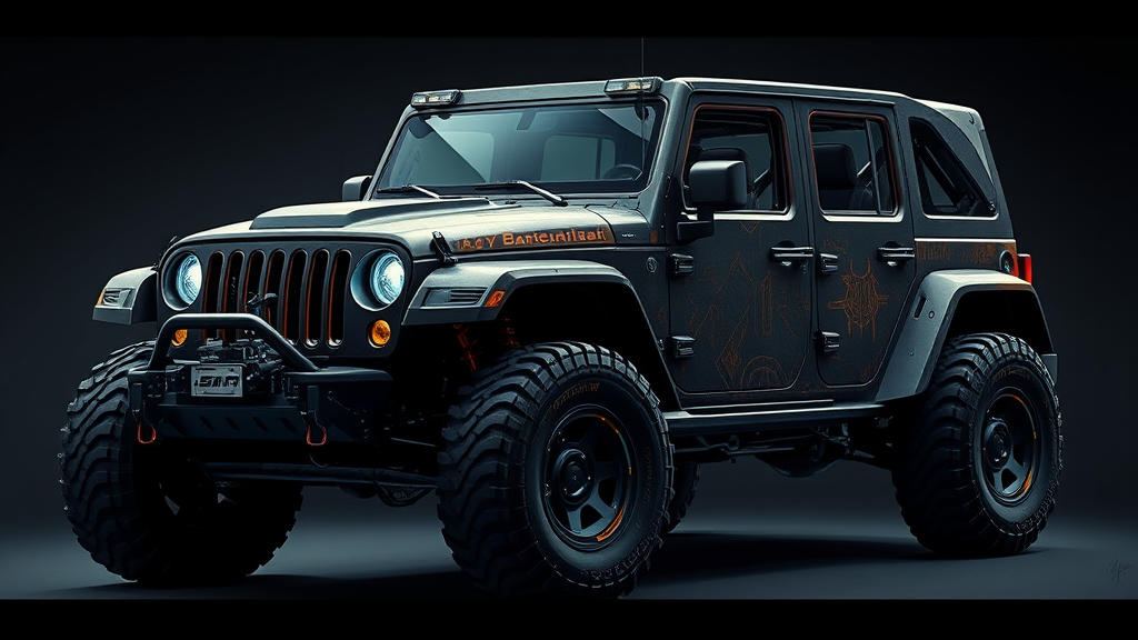 An armored sci-fi Jeep reminiscent of Halo, blending the rugged elements of rear-heavy alternates and futuristic touches, inspired by car concept and design aesthetics of Sid Mead and Alex Ross. Featuring intricate details and dynamic curves, the concept art captures a cinematic feel with dramatic, dynamic lighting and a matte painting style. The highly detailed Jeep employs the rule of thirds in its composition, appearing centered within the frame, creating a clean and denoised render. Its robust exterior is accentuated by sleek armor plating, and beneath a transparent, high-tech cockpit canopy, the interior reveals advanced control panels. The vivid color palette brings out contrasting textures, emphasizing the artful balance of form and function.