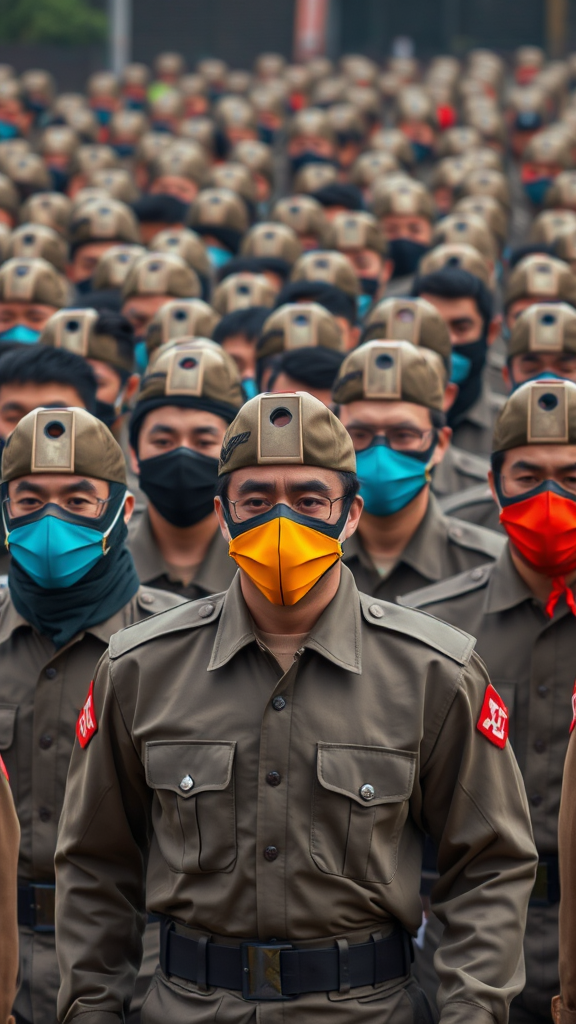 An army of diverse men from various ethnic backgrounds, all donning identical masks reminiscent of Tyler the Creator's Chromakopia style, marches in perfect unison; their attire is a fusion of modern military and elements inspired by Korean ceremonial uniforms. The photograph captures the discipline and unity of these soldiers, as they stride forward with determined expressions visible through the eye holes of their masks, the vibrant colors of the masks creating a striking contrast against the subdued tones of their uniforms. The image conveys a sense of purpose and solidarity, with each soldier symbolizing a blend of individuality and collective strength.