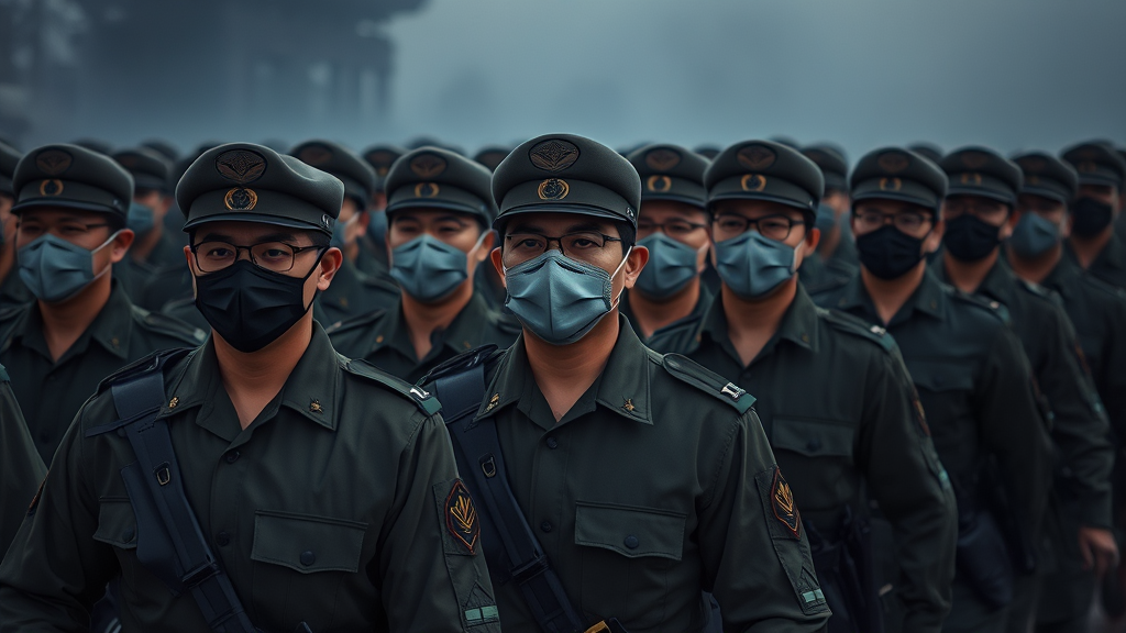 An army of men from diverse ethnic backgrounds, each wearing a distinct mask reminiscent of Tyler the Creator's Chromakopia, photographed in striking military precision; the soldiers, clad in uniform attire, march in unison, evoking a sense of order and discipline inspired by Korean military traditions, against a backdrop of atmospheric fog and dramatic lighting, lending an artistic flair to the powerful imagery of unity and strength amidst their shared purpose.