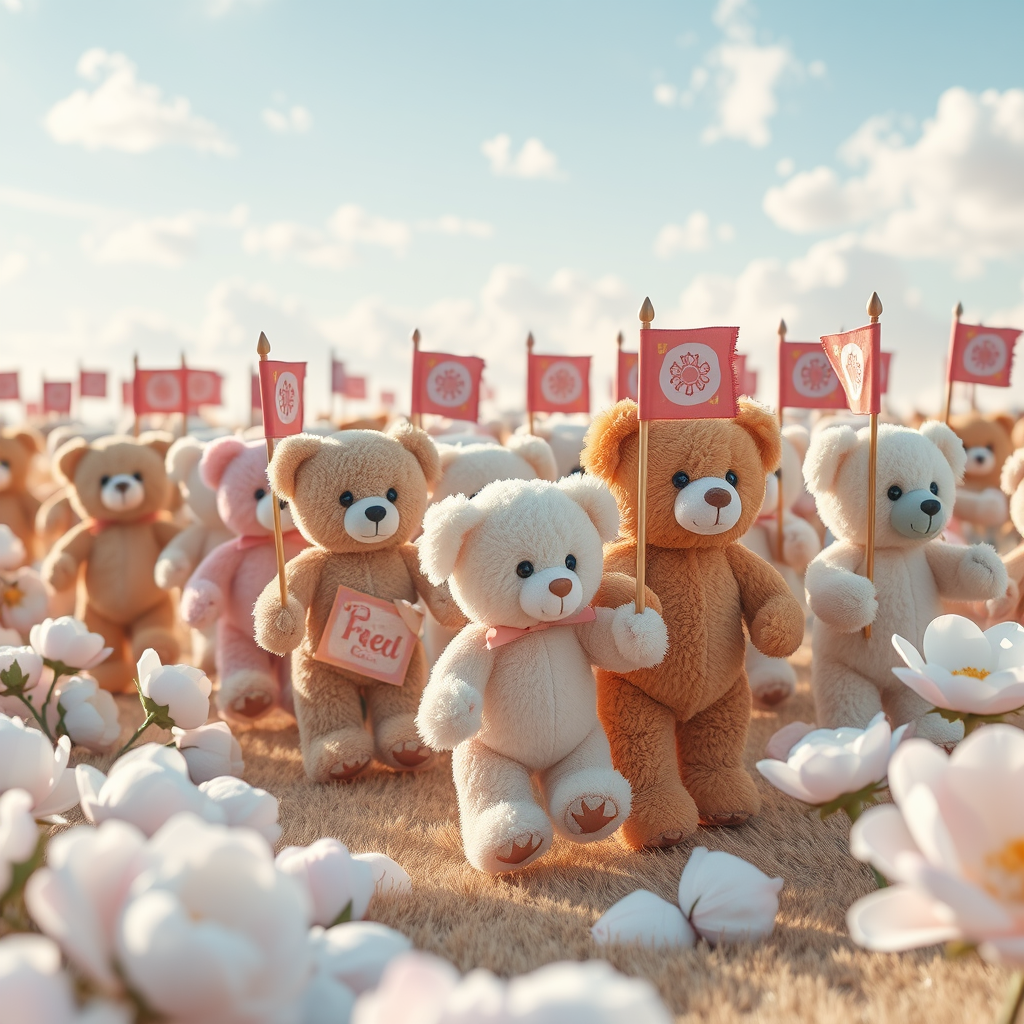 An army of plush teddy bears, featuring a diverse range of sizes and colors, marching in a whimsical parade through a dreamy landscape filled with cotton-candy clouds and oversized, blooming flowers. Soft sunlight casts a gentle glow on their fuzzy fur, while they hold tiny flags emblazoned with playful patterns. In the background, a serene, pastel-colored sky stretches beyond, sprinkled with wispy, friendly clouds. Dreamlike and enchanting, the scene captures both the innocence and valiant spirit of the toy bears as they venture forward.