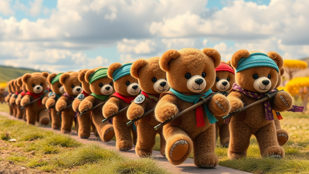 An army of plush teddy bears, marching bravely through a vibrant, whimsical landscape, under a sky filled with fluffy clouds. Each bear is uniquely adorned, some with tiny armor and others with colorful scarves, their eyes gleaming with determination. The scene captures a sense of playfulness and adventure, where the bears move with synchronized precision, ready to tackle any obstacle in their path.