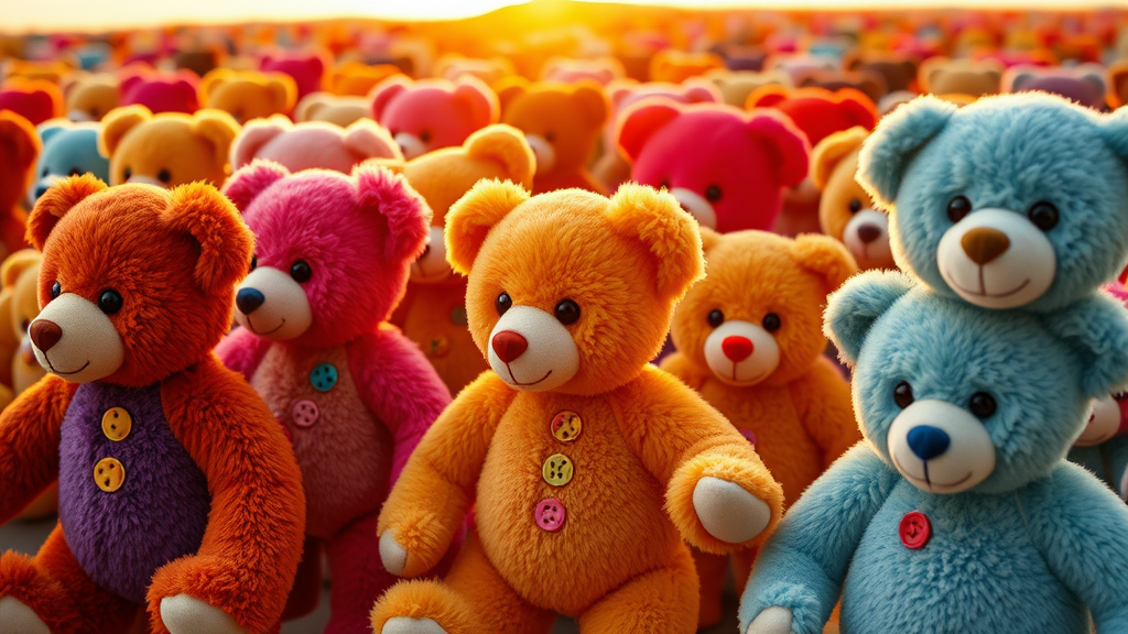 An army of plush teddy bears, vibrant and diverse, marching with purpose, their soft fur catching the golden light of a setting sun, each one uniquely adorned with colorful patches and buttons, exuding a whimsical charm, while maintaining an air of gentle determination, reflecting a heartwarming yet formidable presence.