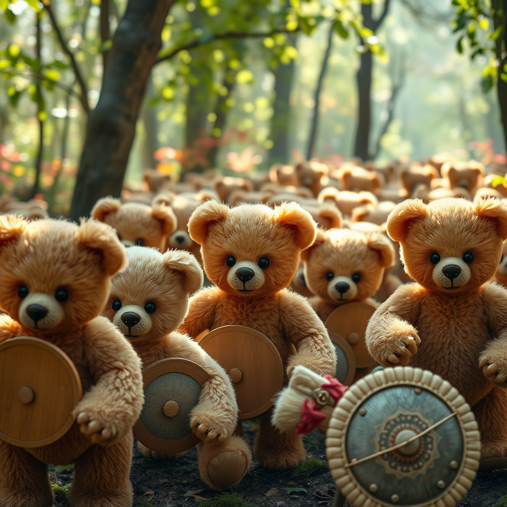 An army of teddy bears advancing through a magical forest, their plush fur blending with the vibrant colors of the surroundings, sunlight filtering through the leaves casting dappled shadows, their button eyes gleaming with determination, paws clutching tiny wooden shields and soft fabric swords, a sense of whimsical bravery in the air.