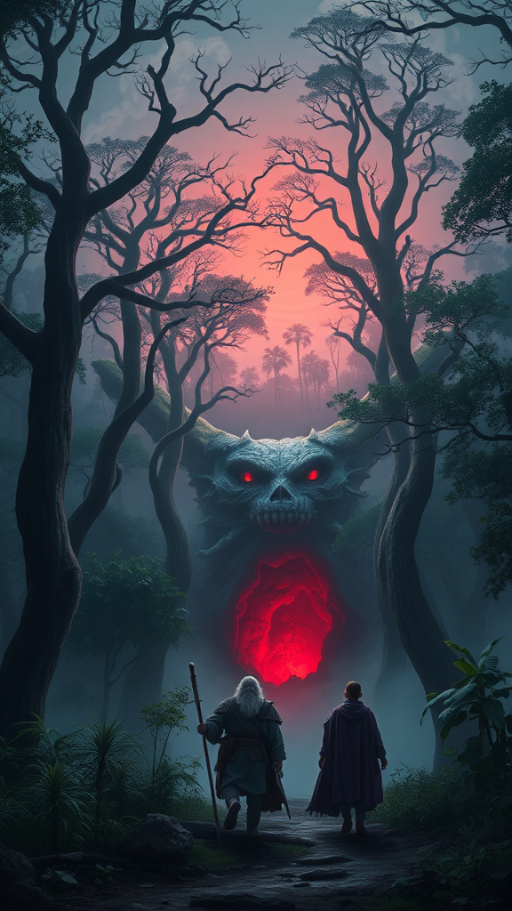 An army of towering trees stood sentinel in the Kelunwa Forest, their gnarled branches stretching like skeletal fingers towards a sky veiled in swirling, smoke-like mist. Shadows danced and flickered among the dense foliage, while the ethereal glow of unseen eyes pierced the darkness, hinting at creatures lurking just beyond sight. At the center of this silent, ominous stretch lay a cave, its entrance like the monstrous maw of a beast, from which a sinister red glow pulsed with a life of its own. Into this enigmatic forest trudged an unlikely trio. At the forefront, the King—a venerable figure, his weary, sunken eyes entrenched deep in wisdom and memory—leaned heavily on a staff meticulously carved with the stories of his ancestors. His tattered royal cloak, once rich purple, now muted and worn, trailed the forest floor, whispering tales of bygone battles and forgotten glories with every step. To his side walked Prince Chidi, resolute and unyielding, each stride exuding strength and purpose. A leather tunic clung to his powerful frame, complemented by a hunter’s cape that rustled softly with the weight of silent determination. In his grip, a ceremonial sword gleamed, its blade a testament to Chidi's courage and the legacy he was determined to uphold. Trailing behind was the Chief Priest, an enigmatic figure shrouded in sacred mystery. His gaunt form was draped in flowing robes of white and red, embellished with beads and cowrie shells that clicked softly with each movement. His face bore intricate sacred markings, obscured partially by layers of paint that seemed to shift with the shadows, as though they too were alive. Together, the trio advanced deeper into the heart of Kelunwa, drawn inexorably towards the cave's ominous glow, their fate intertwined with the ancient secrets hidden within this foreboding forest.